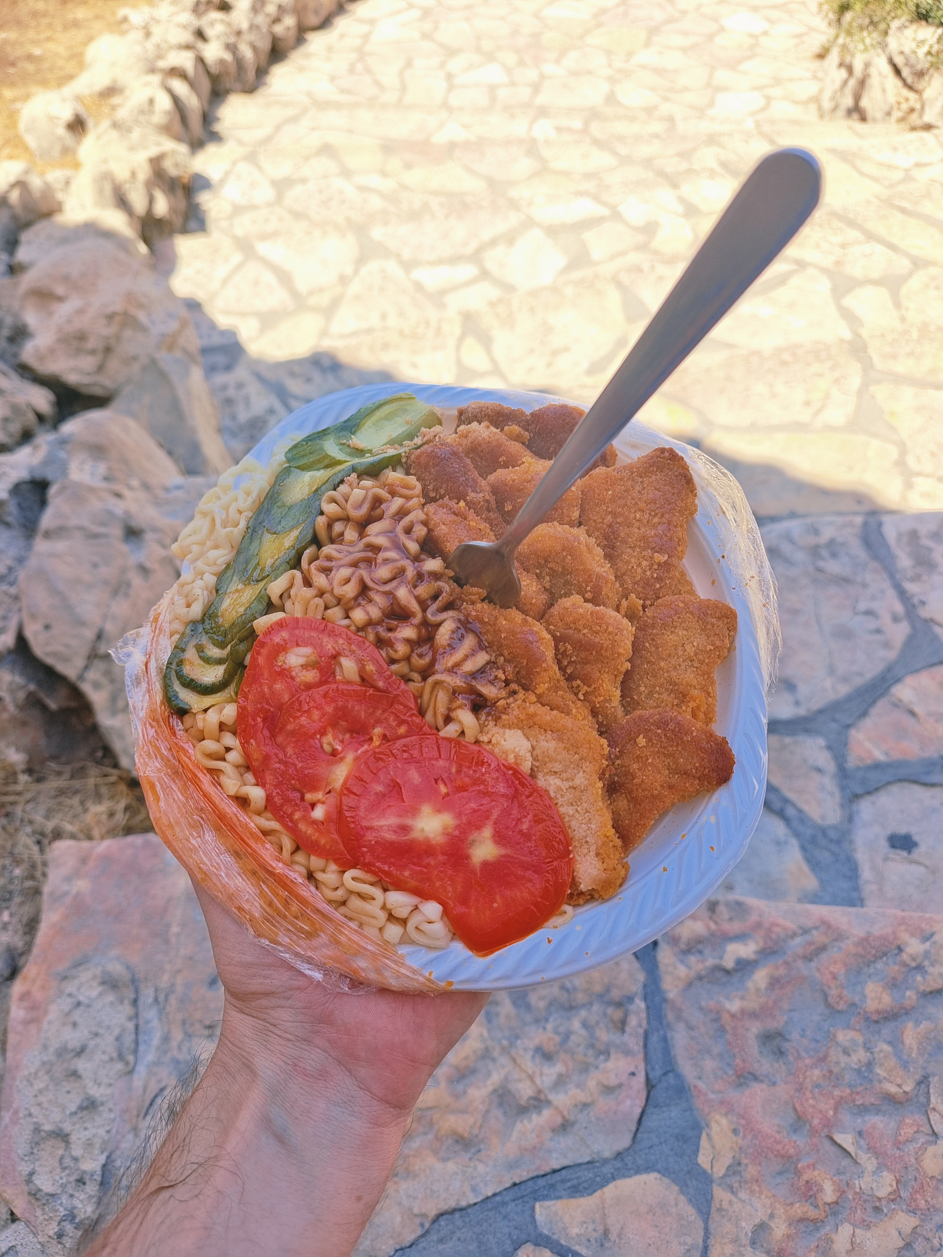 I found a gas station with a café nearby. I parked my bike, bought some cold mango juice, and ate my homemade lunch. But still, I was so tired that I decided to take a nap right there at the table. After sleeping for 3 hours, I woke up and got ready to continue my journey. I bought 3 liters of cold water and moved on. Since the hottest part of the day was over, I felt more confident and energized. To stay cool, I made sure to wet my head, chest, and back frequently and also took breaks in the shade of trees. This is an important tip for cyclists traveling in hot weather.